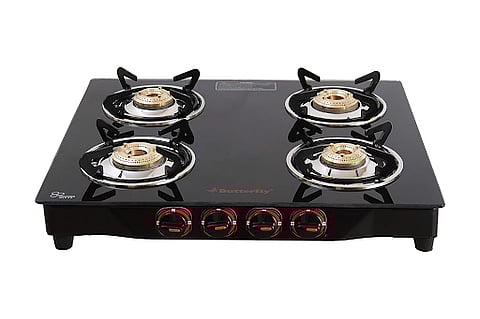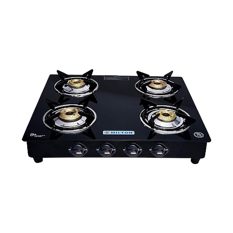 Best budget: The MILTON Premium 4 Burner Black Gas Stove offers affordability without compromising on quality, featuring durable brass burners and a toughened glass top at a budget-friendly price point.