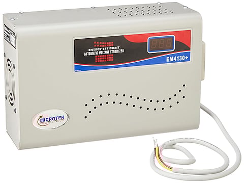 Best Stabilizer for 1 Ton AC: Microtek EM 4130 Automatic Air Conditioners (A.C.) Voltage Stabilizer Upto 1.5 Ton with a working power of 130V-300V offers convenient LED indicators, auto start functionality, and a wall-mounted design for easy installation.