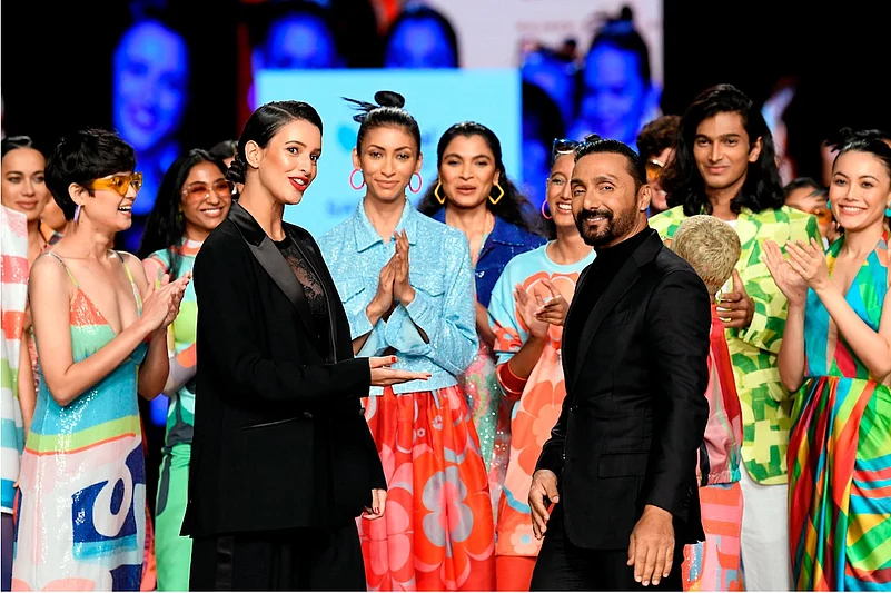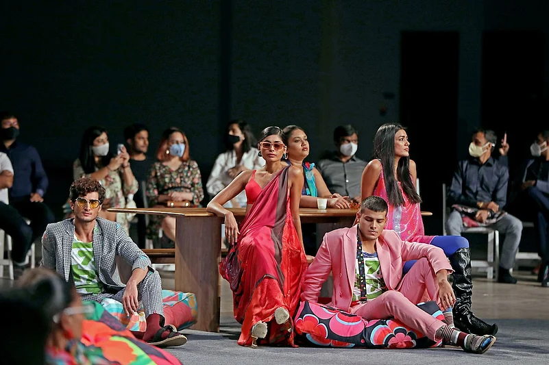 Rajesh Pratap Singh, Creative Director of the Satya Paul label kept the ethos of the Satya Paul style with athleisure, some dance tracks, along with trippy memories and contradicted it by the 70’s and 80’s looks of the collection. Rajesh was also inspired by Satya Paul’s love for calligraphy, which appeared on Mr Paul’s walls along with quotes from luminaries like Rumi and Osho, which were very relevant. There were simple words like love and they appeared in modern typography to encompass these zippy memories. Suspenders made a nostalgic appearance, many of which were from the late designer’s personal collection. Bringing in some of the practical styles for dresses, trousers and shirts, which were made from carbon zero TENCEL™ a sustainable yarn that is entirely biodegradable and its only residue is water that regenerates the earth; the look was relaxed but contemporary.