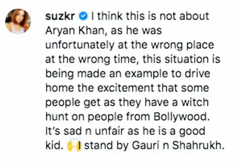 Sussanne Khan, who is said to be a close family friend of the Khans, commented on a journalist's Instagram post. She wrote, “I think this is not about Aryan Khan, as he was unfortunately at the wrong place at the wrong time. This situation is being made an example to drive home the excitement that some people get as they have a witch hunt on people from Bollywood (sic).” The journalist in the post had claimed that the arrest of Aryan Khan should be taken as "a wakeup call for parents."