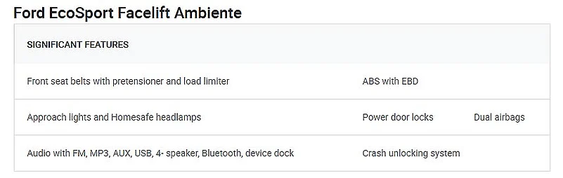 As we can see, the base model of the upcoming Ford EcoSport facelift is equipped with all the features a regular buyer would look for. It gets safety features such as dual airbags and ABS with EBD as standard along with a modern audio system, which is usually absent in base models of most vehicles. This should make it a smart value-for-money option, unless there’s a substantial hike in its starting price, that is.
