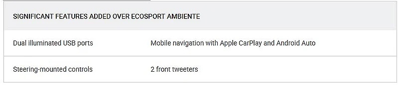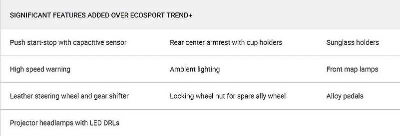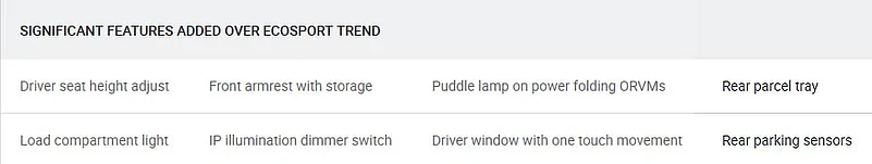 On top of the standard features available in Ambient, the Trend variant gets the 8 inch floating touchscreen infotainment screen which forms the essence of the newly designed dashboard in EcoSport facelift. If the MyFord dock, which places your phone securely to be used as a touchscreen unit, cannot serve its purpose, then you can go for the Trend variant. It also gets Apple CarPlay and Android Auto, 2 front tweeters, steering-mounted controls and rear seat back pockets, making it a tad convenient and much more likeable.
