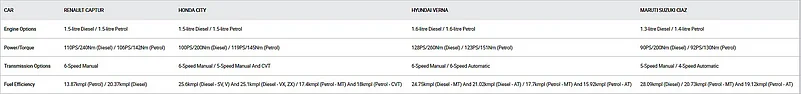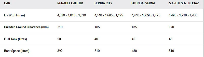 All the cars in this spec comparison are offered with petrol and diesel engines. As far as the diesel power and torque figures are concerned, the Captur pips the Maruti and the Honda but falls behind the Hyundai. When we compare the petrol motors, the Captur only manages to outshine the Maruti, as the Honda and Hyundai are considerably more powerful. The Captur also lacks an automatic transmission, making do with a manual gearbox. The Captur isn’t even as frugal as the sedans in the equation. Based on the above table alone, the Captur doesn’t seem to add up. But the story doesn’t end here.