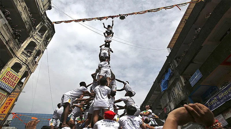 The ‘dahi handi’ ritual is part of the Janmashtami Festival. It is celebrated in Maharashtra where young boys (called Govindas) form human pyramid and break an earthen pot filled with curd or buttermilk hanging mid-air.
