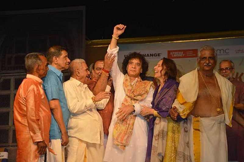 Even before that endeavour, the tabla wizard had sensed the grandeur and intricacies of Kerala’s traditional ensembles when they annually made inroads into Mumbai where he grew up. The commercial metropolis used to host—as it continues to—shows of chenda masters in big formations called melam and much smaller ones called tayambaka, where the focus would be on the lead chenda instrumentalist. Those 90-minute concerts organised by a Malayali cultural organisation called Keli often left Zakir with admiration, which he would openly demonstrate in a state of awe.