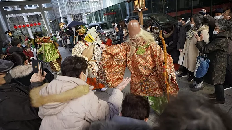 The Konpira Festival is being observed in Japan's capital Tokyo. Artists depicting Seven Lucky Gods performed a ritual ceremony of the First Konpira Festival during the Konpira Festival at Kotohiragu shrine in Toranomon business district of Tokyo. Artists wore traditional clown masks and lion masks as they performed rituals.