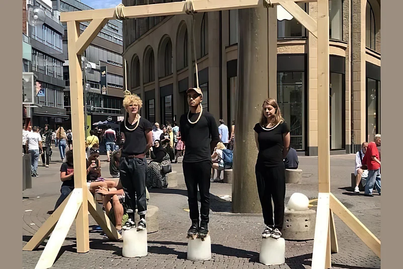 The students stood on ice, with nooses tied around their necks to enact a scene of hanging from the gallows.