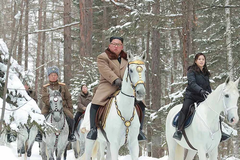 The Korean Central News Agency released many photos showing Kim taking a horse riding to snow-covered Mount Paektu along with his wife and other top lieutenants, also on white horses. Kim also climbed the mountain, the highest peak on the Korean Peninsula, on horseback in mid-October.
