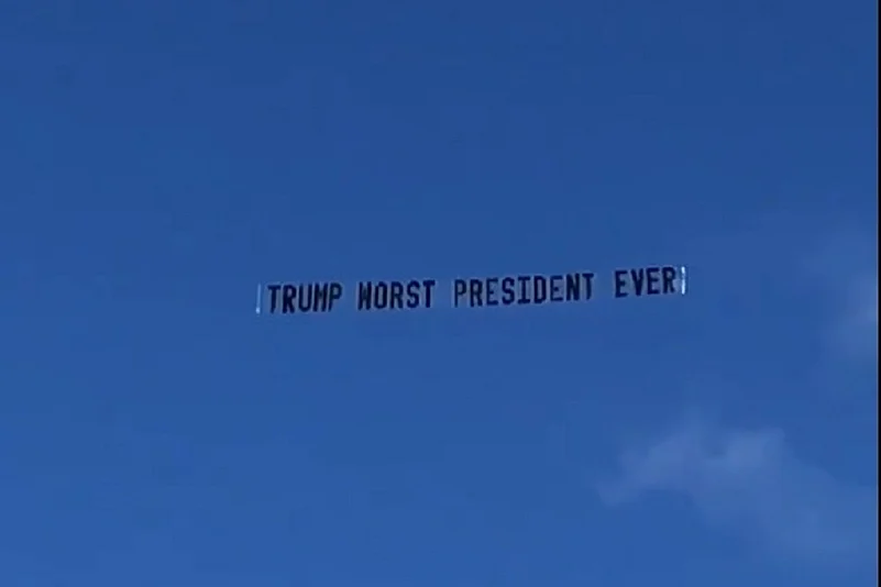 "Trump worst President ever" and "Pathetic Loser" read the writings in the skies.