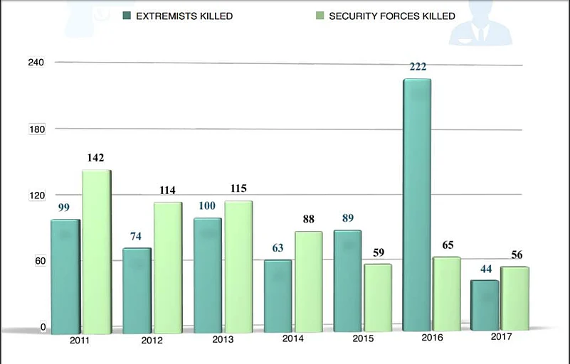 The kill ratio for security forces was in the negative in 2011, 2012, 2013, 2014 and 2017 present. The forces managed to buck the fatal trend only in 2015 and 2016.