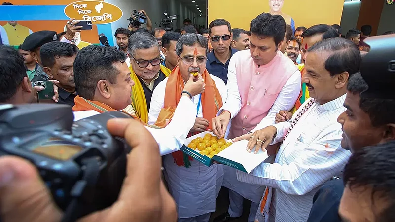 The leaders and supporters of BJP in northeast’s Tripura held celebrations over the party’s performance in the state elections.