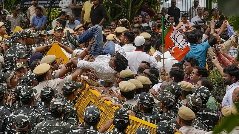 BJP workers staged a protest outside the Delhi assembly today against AAP chief Arvind Kejriwal who was questioned by the CBI yesterday for his role in the alleged Delhi excise policy case. Some protestors tried to breach the barricade placed by security personnel.