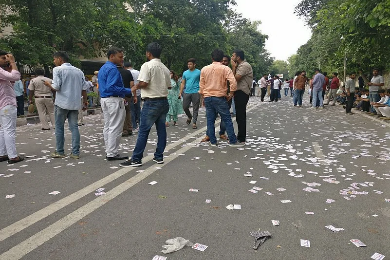 A person wearing a question mark sign was detained by police outside the Ramjas College, but after it was found he had a college ID card, he was let off. Some members of parties, who were seen canvassing for votes, were warned by the police personnel.
