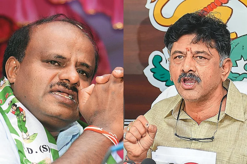 The rumblings within the coalition were first heard in the Congress—it has about six ministerial berths to fill, which would need deft handling of the ambitions of local leaders. So far, it has managed to keep its flock together—in particular, the siblings Ramesh and Satish Jarkiholi from Belgaum, who seemingly have a grouse against Karnataka water resources minister D.K. Shivakumar of the Congress exerting his influence in their turf. Shivakumar is battling problems on another front too, alleging political vendetta behind the Enforcement Directorate registering a money-laundering case against him last week. As one of the wealthiest legislators in the state, he had played a key role in bringing the JD(S)-Congress combine to power in May by thwarting the BJP’s efforts to woo their legislators.