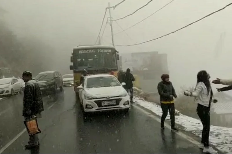 After having failed to cheer-up hundreds of tourists and revellers on Christmas, snowfall greeted the famous hill destinations of Shimla and Manali on Sunday, bringing delight to holiday makers .