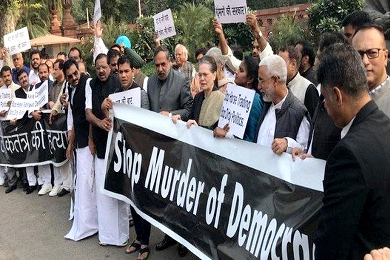 Congress leaders like Anand Sharma and Adheer Choudhury raised slogans and held placards criticising the BJP, calling the midnight coup in which the BJP sought to form a government with Ajit Pawar a "murder of democracy".