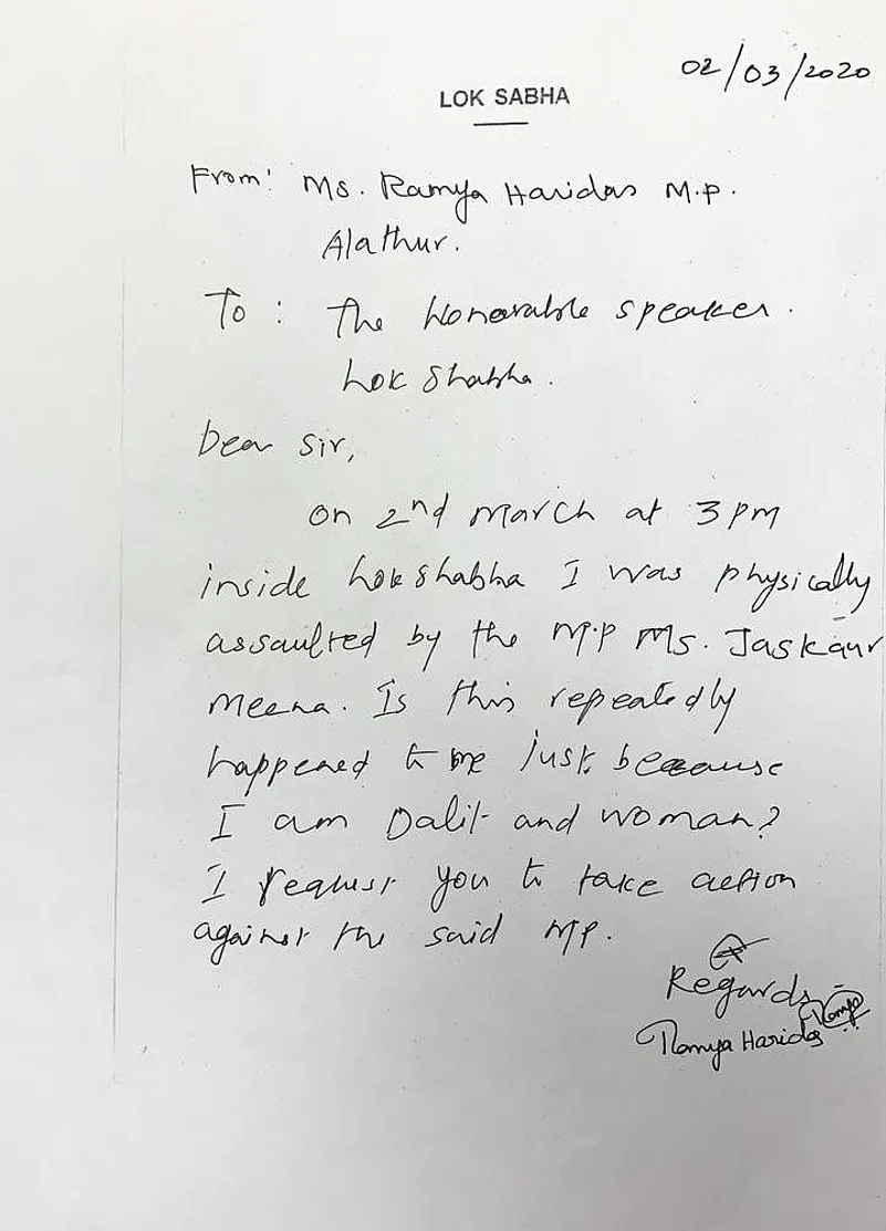 “On 2nd March at 3PM inside Lok Sabha I was physically assaulted by the MP Ms Jaskaur Meena. Is this repeateadly happened to me just because I am Dalit and woman?. I request you to take action against the said MP. (sic),” the letter read.