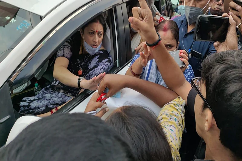 Union Minister Smriti Irani’s car was stopped by Congress workers protesting over the Hathras gang-rape case in Varanasi. The workers demanded her resignation over the increasing sexual assault cases.