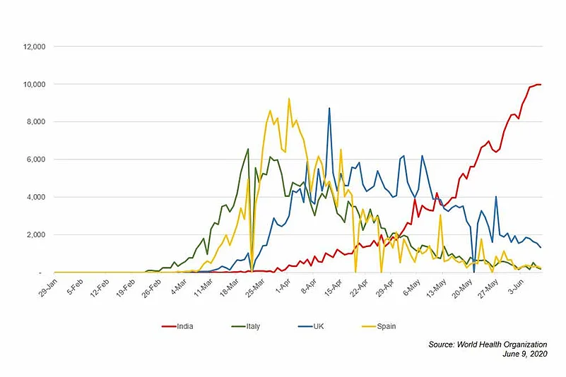 Yes, it’s still exponential: with the chart galloping at 10,000 cases a day, India will be skimming 3 lakh by the time these words reach you. If this pattern continues through June-July, the figures will begin to look very scary. But there’s reason for some grim comfort: cases will go up as long as the Reproduction number of the infection (also called R0, pronounced ‘R nought’) is greater than one—essentially, that means one affected person can infect more than one person on average. “It’s not a big surprise that every day will bring a new record. The thing we need to really worry about is whether the rate of growth has increased or not,” says Sinha.