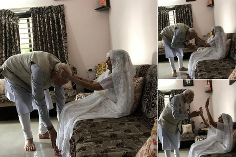 7:30 am: Prime Minister Narendra Modi meets his mother at her residence in Gandhinagar today.