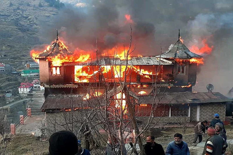 The sprawling residential complex, made of deodar, took only a few minutes to get reduced to rubble even as locals rushed to the spot to douse the flames.