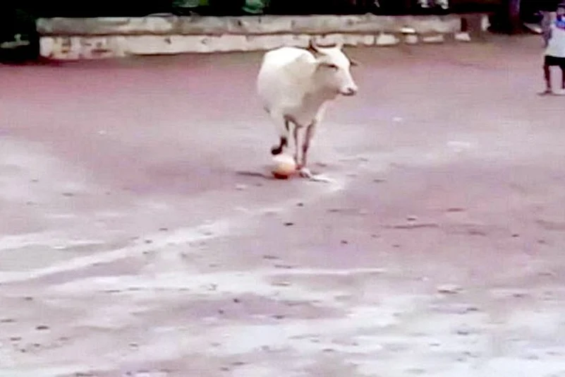 The video was reportedly shot in the Mardol area of Goa, and shows a group of young boys playing in a football field when the ball lands near the cow, and it takes charge.