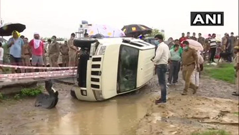 The overturned car, according to the police, in which Vikas Dubey was being brought to Kanpur (ANI/Twitter)