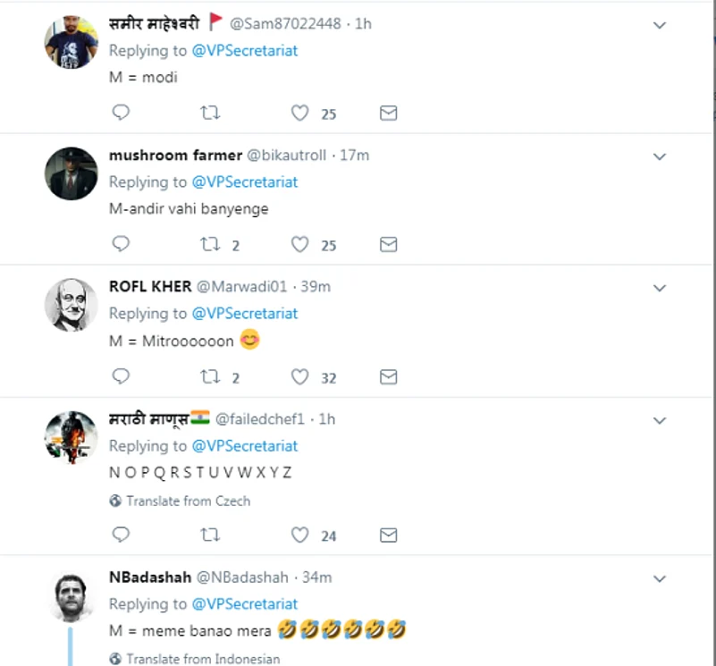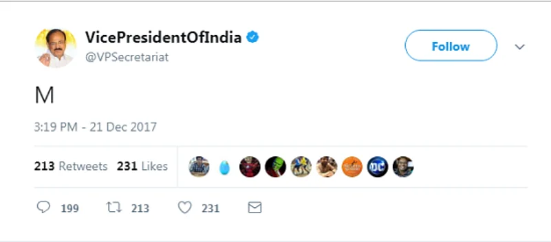 The official handle of the Vice President of India tweeted 'M', possibly inadvertently, capturing the imagination of twitter users, nevertheless.