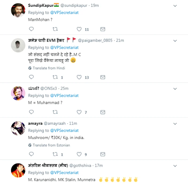 What did Venkaiah Naidu mean when he tweeted an 'M'- was it 'Mitroo', 'Modi', or 'Manmohan'- Twitter users have some suggestions.