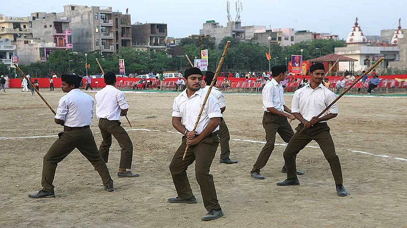 RSS volunteers perform drill in their new uniform in New Delhi.