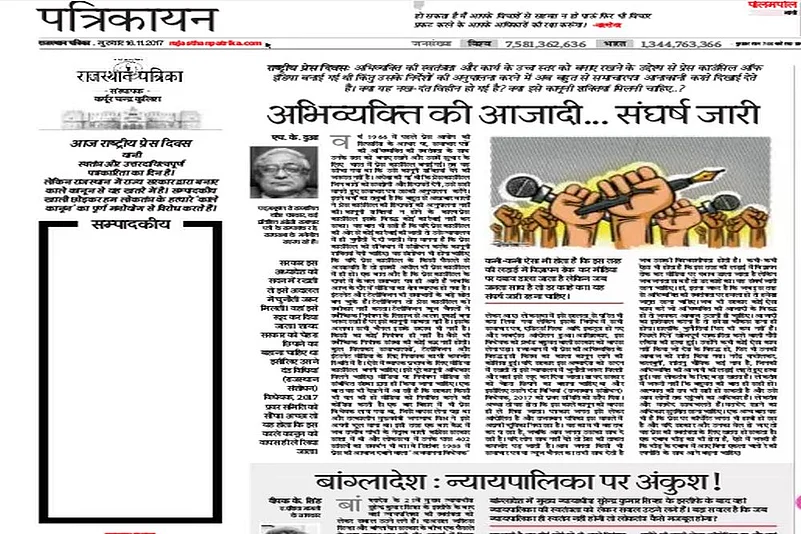 Rajasthan Patrika, a leading Hindi newspaper in the state, on Thursday — also National Press Day -- left its editorial column blank to register its strong protest against the Vasundhara Raje-led BJP government’s controversial shield-and-gag ordinance