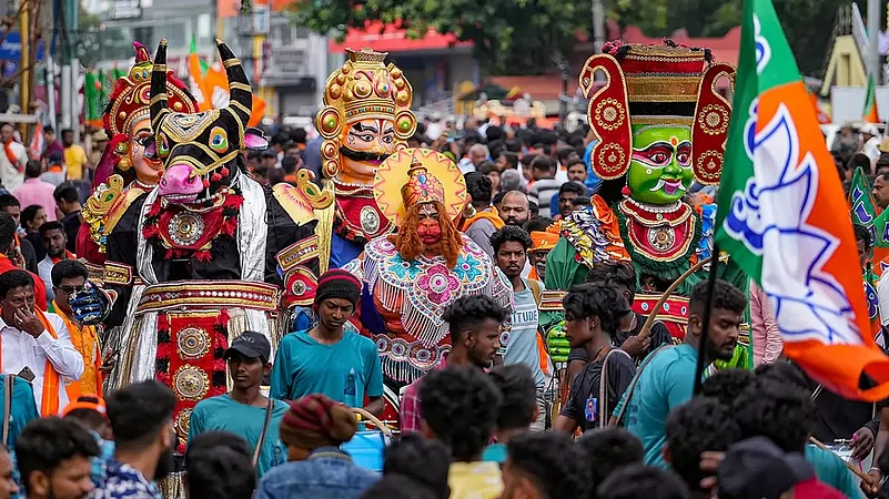 The entire distance is covered with saffron hues as BJP flags are put up on either side of the road, and thousands of party workers and supporters too wearing saffron shawls and caps.