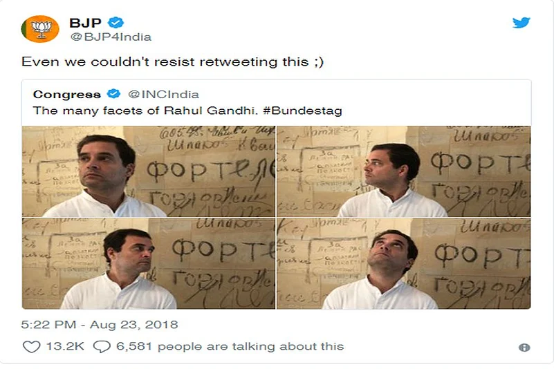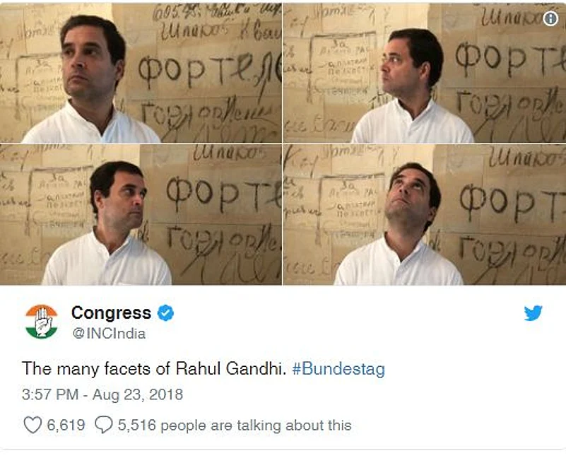 A post on Thursday by the Congress' Twitter handle showing pictures of its president Rahul Gandhi looking in different directions at German Parliament invited a variety of responses, with the ruling BJP retweeting it, saying it couldn't resist doing so.