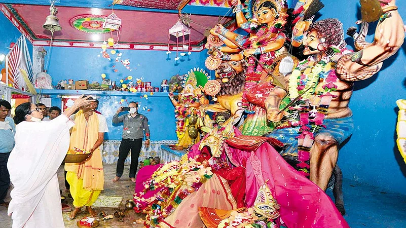 Over the past few months, Mamata has been trying to highlight her identity as a devout Hindu, chanting Sanskrit mantras, talking about her personal involvement with different pujas, including Kali Puja, and visiting temple after temple. Last September, she announced a monthly stipend for Brahmins and a housing scheme for the poor among them. Her overtures have not gone unnoticed, but they are not working in her favour everywhere. “It is the BJP’s victory. They made her focus on Hindus,” says Bimal Maity, a taxi driver in East Midnapore’s Chandipur area. “Just like Muslims, Hindus too must vote together to influence government policies.”