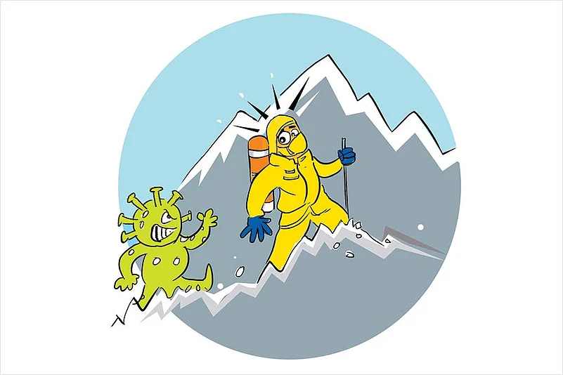 This climbing season—the short fair-weather April-May window—Nepalese authorities can hope mountaineers infected with Covid won’t pass it on to anybody else because “scalars aren’t vectors”. Jokes apart, what other alibi could they call up other than the obvious—dollars of rich foreigners—in their new record of issuing 394 permits so far for expeditions to Mount Everest? The previous feat was 381 permits in 2019, the year 10 climbers died as they were all stopped nearly three hours at dizzying altitudes—forced to burn up their precious oxygen supplies as they waited for a crowd of 150 others to clear the Hillary Step, the “death zone”. A foreign climber pays US$ 11,000 for the permission. For the record, Covid is a nifty climber too, and cases have been reported at the Everest base camp.