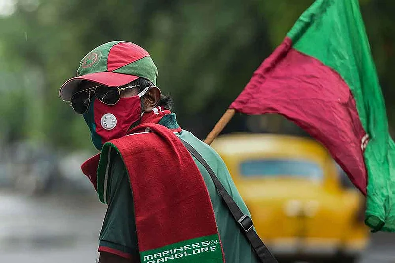 A fan on Mohun Bagan Day—celebrated every July 29 to mark the Calcutta team’s historic victory over East Yorkshire Regiment in the IFA Shield final in 1911.