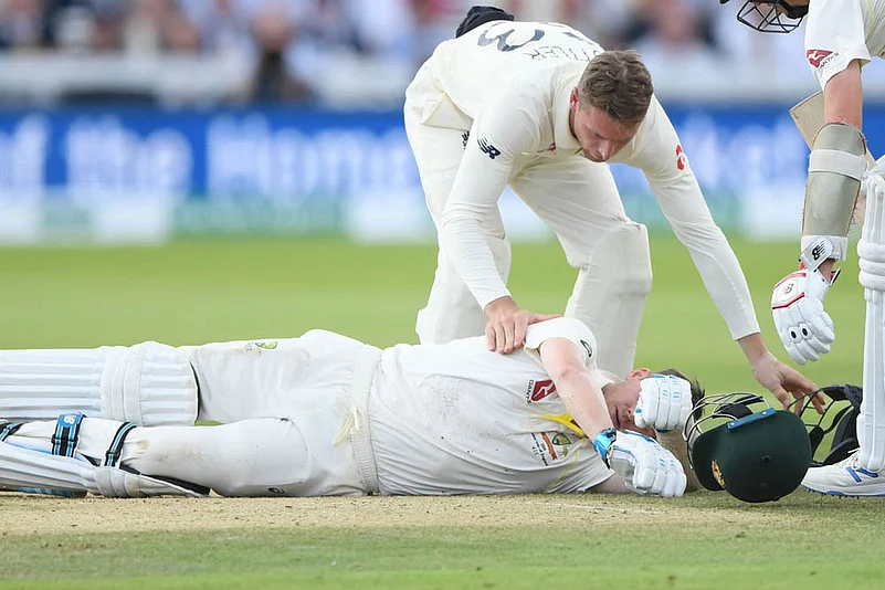 Having worn a lifting delivery on the forearm, Smith was left prone on the turf when he ducked into an Archer bouncer, prompting immediate concern.