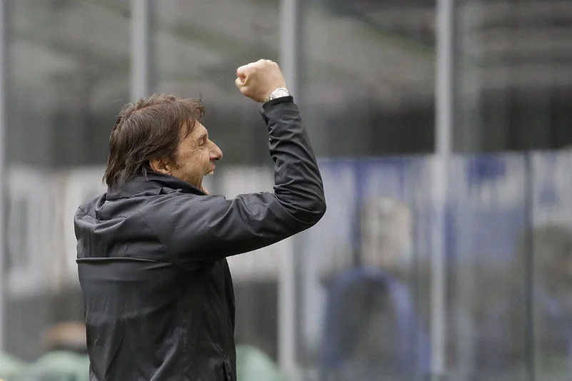Conte reacted to the goal by running down the sideline and leaping into a celebratory huddle with his players before then planting a kiss on creator Hakimi.