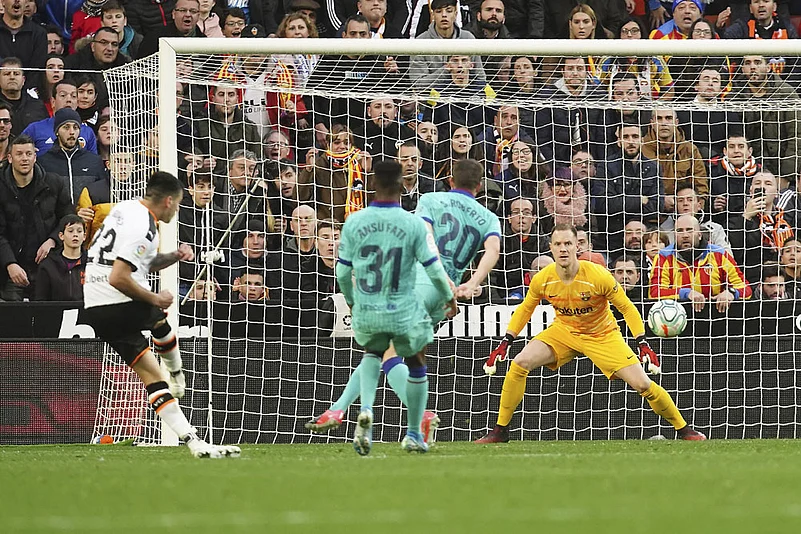 Valencia forward Gomez has now scored or assisted in five of his past six LaLiga appearances against Barcelona. He was at the centre of his side's best work throughout. After missing a penalty, the Uruguay international was unfortunate to strike the crossbar when Ter Stegen's handling was uncertain but then netted a double.