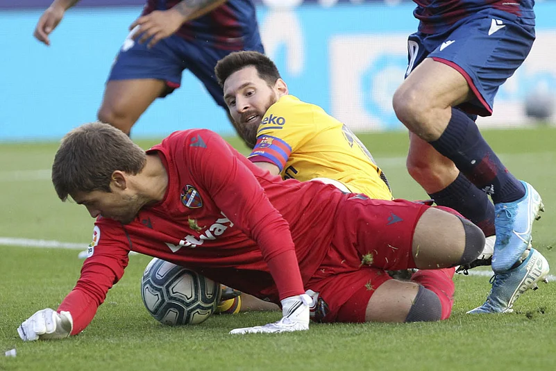 After a quiet start to the contest, Antoine Griezmann saw a right-footed effort saved by the outstretched leg of Levante keeper Aitor Fernandez, Messi's through ball having created the opportunity.