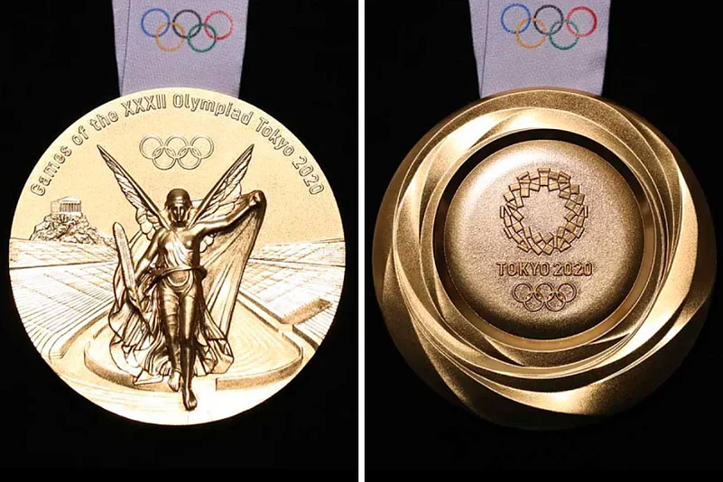 Made of recycled electronic devices and pebble-like in appearance, the medals in the upcoming Tokyo Games will measure 8.5 centimeters in diameter, featuring the flying image of Nike, the Greek goddess of victory.