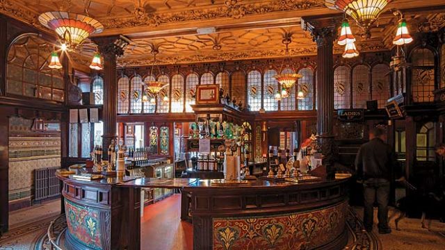 It is not the dining rooms that the visitor sees first (they are up a narrow flight of stairs) but the stylish bar of one of the most lavish and ornate pubs in the UK, set in a public house built for brewer Robert Cain between 1898 and 1900. Outside, a plaque says the Philharmonic Dining Rooms “by virtue of its architectural interest merits the title of a Tetley Heritage Inn.” It’s located at the corner of Hardman St and Hope St in Liverpool’s stately Georgian Quarter of heritage buildings and cobblestoned streets, into which its ashlar stone masonry, slate roof and Art Nouveau metal gates fit quite perfectly.