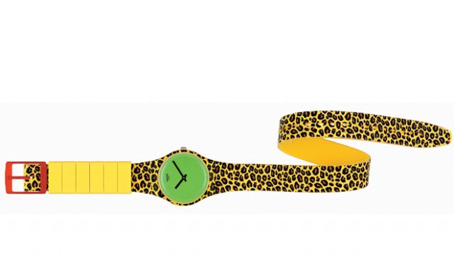 Time for a walk on the wild side.This leopard-print wristwatch with a solid green dial and bright yellow loops is the latest from the Swatch fold. Created by the American designer Jeremy Scott, Swatch Punk comes with a silicone strap that wraps twice around the wrist for double the impact. (Rs 2,650;swatch.com)