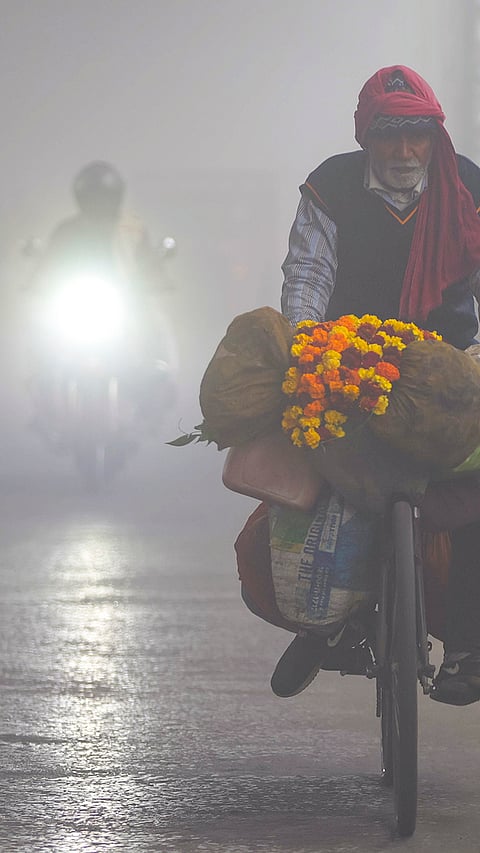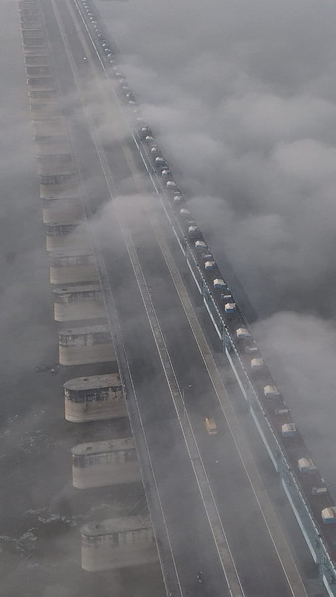 Commuters move at the old Yamuna bridge amid low visibility on a winter morning, in Prayagraj.