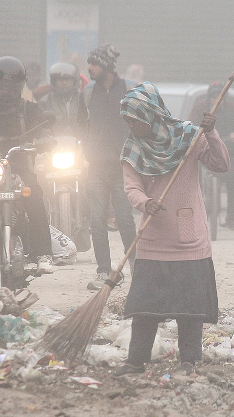 Workers clean a street amid low visibility on a winter morning, in Gurugram.