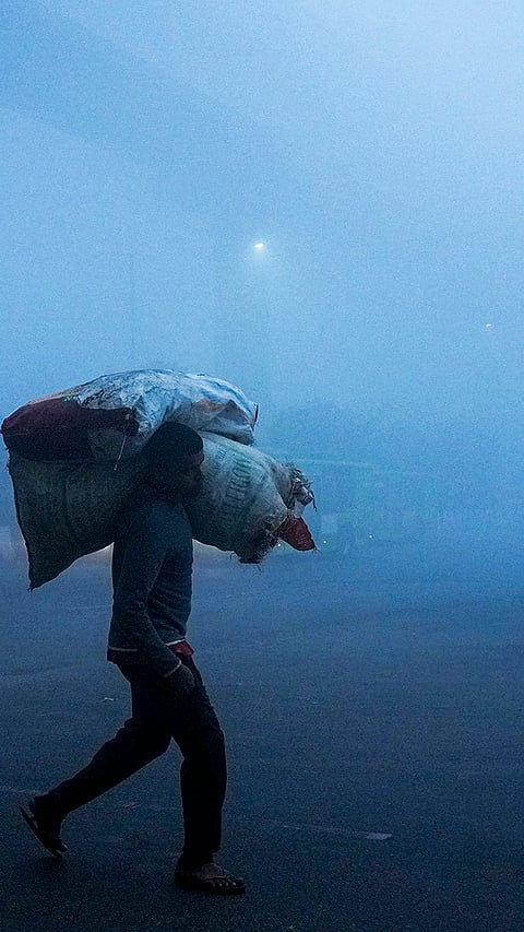 A man carrying sacks of goods walks by amid dense fog on a winter morning, at Mayur Vihar area, in New Delhi.