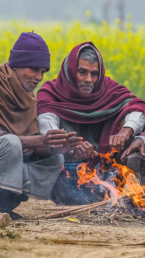 People sit around a bonfire to warm themselves on a winter morning, in Nadia, West Bengal.