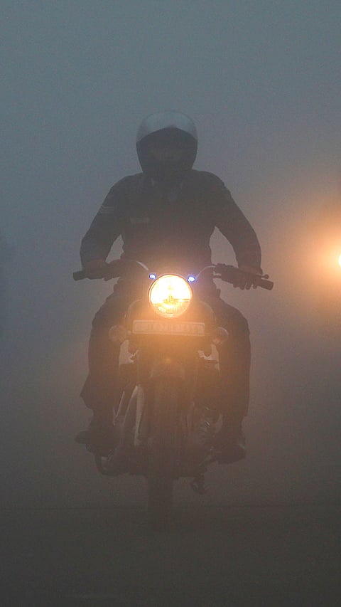 A commuter makes his way on a two-wheeler amid low visibility during a foggy and winter morning, in Jammu.