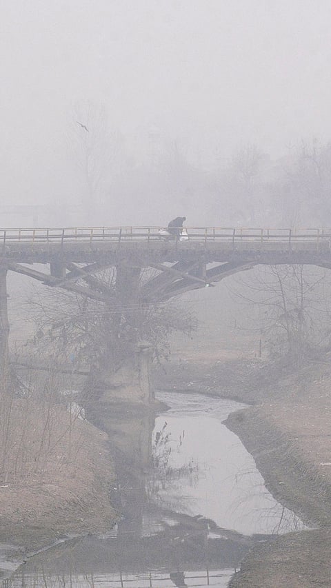 A layer of dense fog shrouds the Mehjoor Nagar Bridge, over a dried water channel due to a prolonged dry spell during the winter season, in Srinagar.