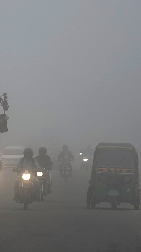 Vehicles move amid low visibility on a road during a foggy winter morning, in Patna.